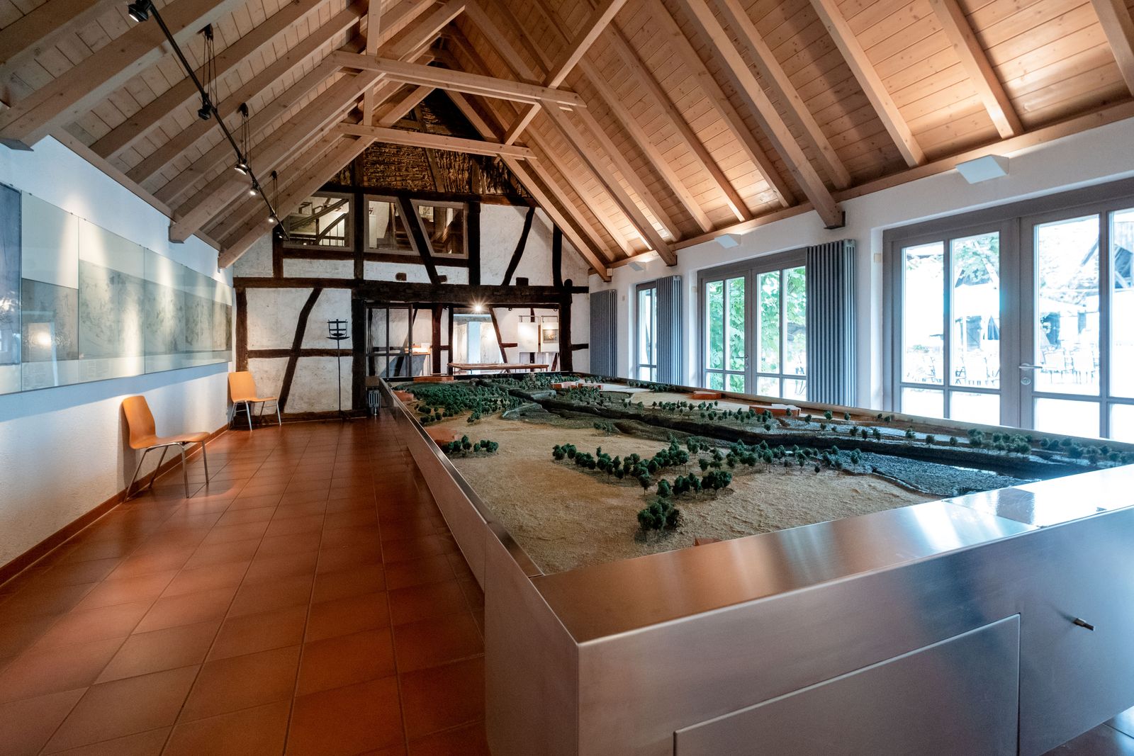 Im Zentrum steht ein 6 x 2,5 Meter großes Rheinauenmodell im Maßstab 1:2000. Es simuliert den Rheinverlauf zwischen Hügelsheim und Steinmauern im Jahr 1852. Das Modell kann geflutet werden und veranschaulicht unterschiedliche Wasserstände vom Niedrigwasser bis zu extremen Hochwasser sowie die Auswirkungen auf das Umland. Der nördlich von Ottersdorf gelegene Teil des Stromes war zu dieser Zeit schon ”rektifiziert” und zeigt den begradigten, in ein Flussbett gebrachten Rhein. Der südliche Abschnitt dagegen war noch Rheinurstromgebiet, mit seinem mäandrierenden, in viele Seitenarme verästelten Flussbett. Pläne und Karten von 1595 bis 1872 dokumentieren daneben die stets bei extremen Hochwässern wechselnden Rheinverläufe in der Riedlandschaft.