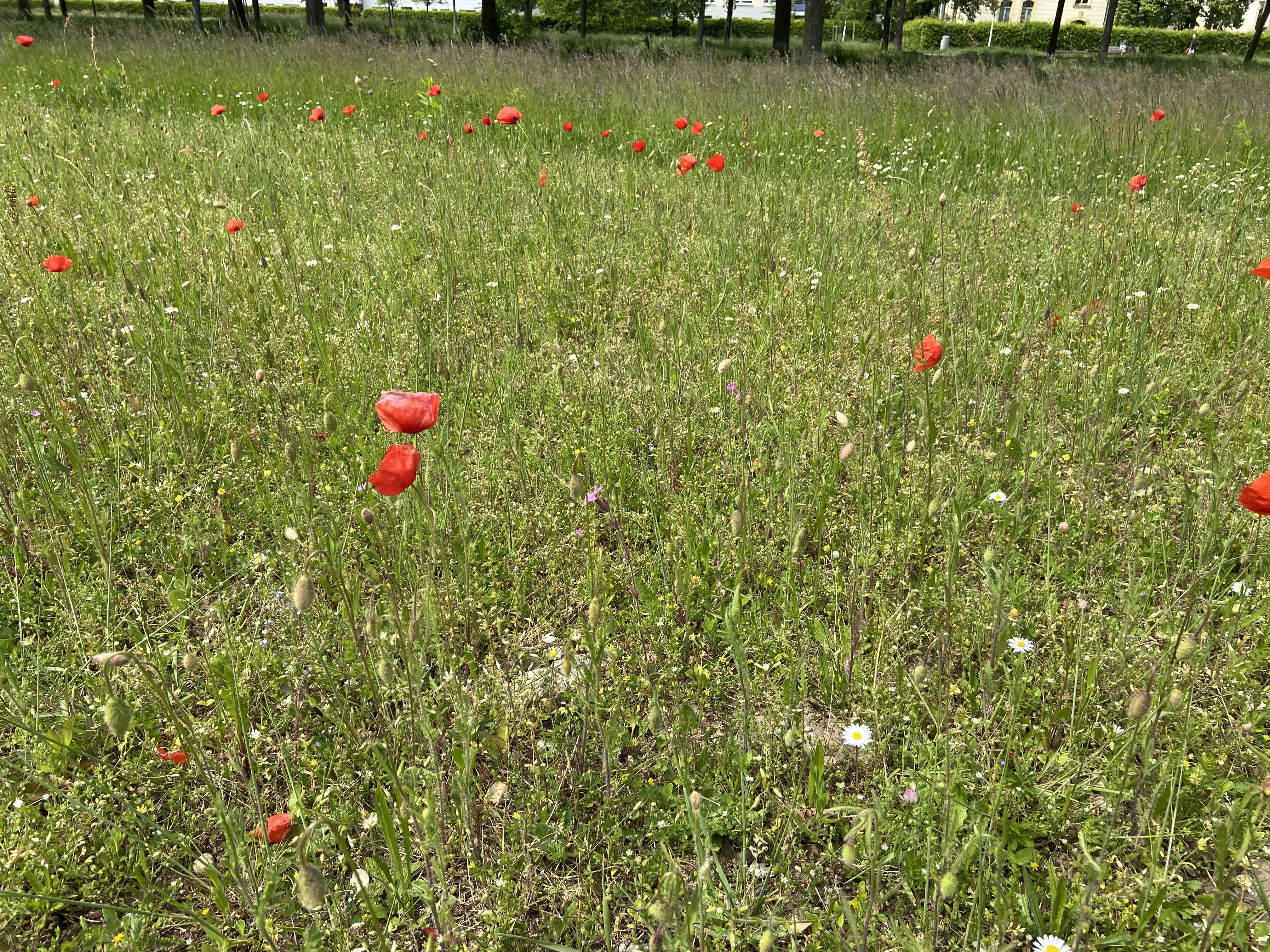 Die Einsaat erfolgt in vorbereiteten Saatbeeten mit regionalem Saatgut. Damit möglichst viele Blühpflanzen zur Samenreife kommen und sich selbständig vermehren können, wird auf den Flächen zweimal jährlich mit einem tierschonenden Balkenmäher gemäht. Der Mahdzeitpunkt richtet sich nach der Blühphase der Pflanze. Dadurch kann es vorkommen, dass die Fläche zeitweise ungepflegt wirkt, was jedoch Teil des natürlichen Entwicklungsprozesses ist. Der Kundenbereich Ökologie und Grün legt bei den Grünanlagen Wert auf langfristige und nachhaltige Entwicklung. „Wir setzen auf mehrjährige, naturnahe Wiesen, die sich selbst erhalten, den Boden schonen, wenig Wasser benötigen und die Artenvielfalt der Stadt fördern“, erklärte Veronika Öder, Kundenbereich Ökologie und Grün.
