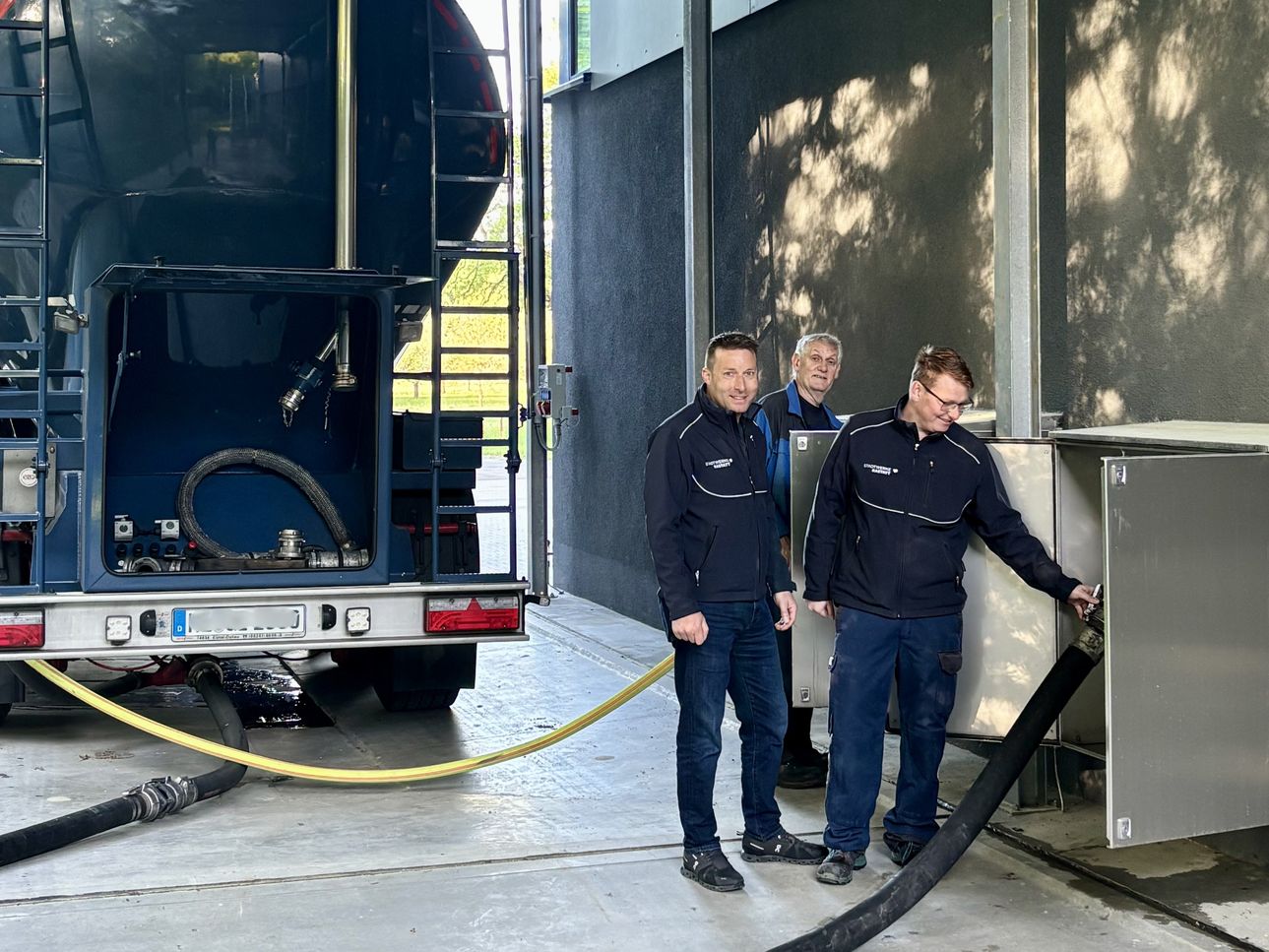 Die neue Aktivkohle wurde per Silofahrzeug angeliefert und ausgetauscht. Dabei erfolgten das Einspülen, Wässern und die Beprobung der frischen Aktivkohle, bevor der Filter wieder in Betrieb genommen wurde. Insgesamt wurden 20 Ku-bikmeter Aktivkohle ersetzt. Die mit PFAS belastete Aktivkohle wurde anschlie-ßend abtransportiert. Sie wird fachgerecht aufbereitet und für den nächsten Fil-terwechsel vorbereitet.