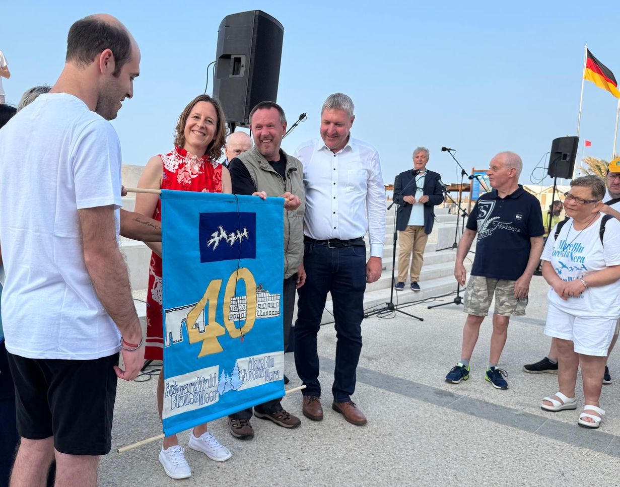 Am neugestalteten „Largo Rastatt“ wurde das 40-jährige Bestehen der Städtepartnerschaft in einem stimmungsvollen Festakt gefeiert. „Seit 40 Jahren verbindet Rastatt und Fano mehr als nur ein historischer Architekt – es ist eine lebendige Freundschaft, die von Begegnungen, Austausch und gegenseitigem Respekt getragen wird. Diese Partnerschaft ist gelebtes Europa.“, so Müller. Neben der Rastatter Oberbürgermeisterin nahmen auch Fanos Bürgermeister Luca Serfilippi, seine Stellvertreterin Loretta Manocchi, Altbürgermeister Massimo Seri sowie Vertreter des Partnerschaftsvereins „Amici senza Frontiere“ teil. Auch Mitglieder der Lebenshilfe Fano, die am Projekt „Schwarzwald Blaues Meer“ beteiligt sind, waren mit dabei. Musikalisch wurde der Abend von der Stadtkapelle Fano begleitet. Schülerinnen und Schüler der Stadt sorgten mit einer Darbietung der Europahymne für bewegende Momente. Den farbenfrohen Abschluss des Festes bildete eine Show der traditionellen Fahnenschwinger.