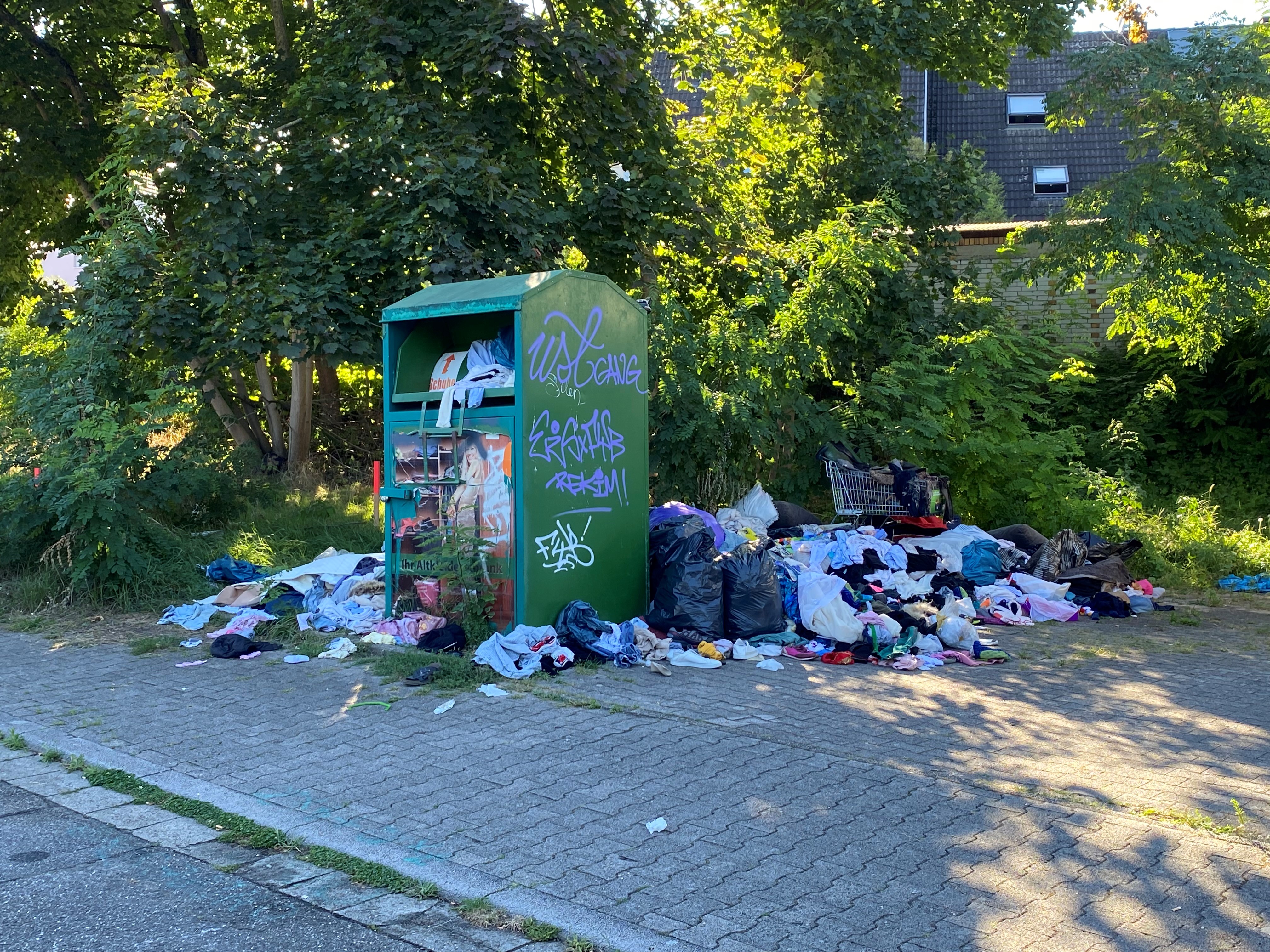 Im Mängelmelder tauchen sie auf, aber oft erst, wenn es zu reichlich Vermüllung gekommen ist: Rund um illegal aufgestellte Kleidercontainer entstehen immer wieder „wilde Deponien“, auf denen neben Kleidung auch anderer Unrat abgeladen wird.