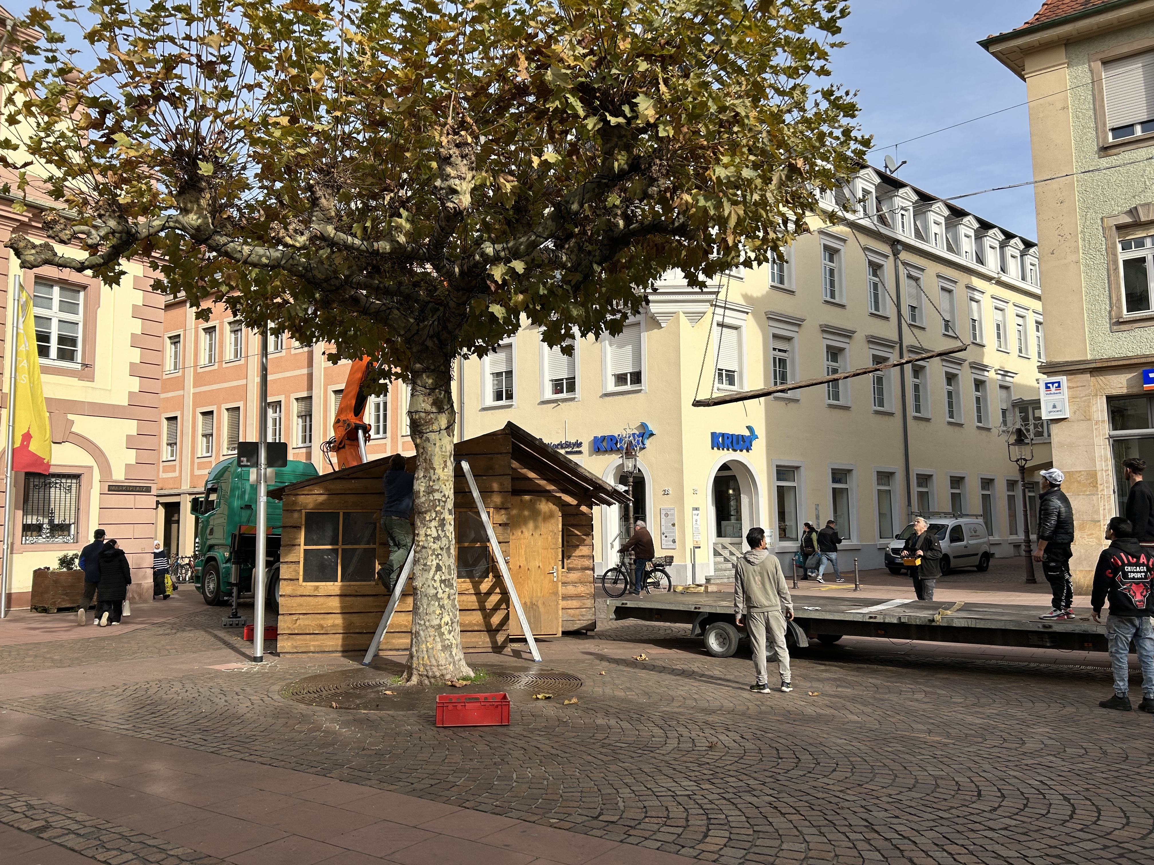 Vorbereitungen für den Rastatter Weihnachtsmarkt haben begonnen: Bänke am Marktplatz werden abgebaut/Aktionshütte steht