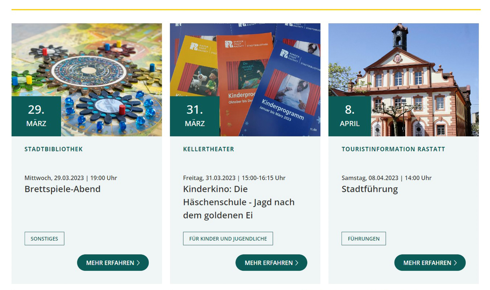 In Rastatt ist immer etwas los: Was genau, das kann im städtischen Veranstaltungskalender nachgeschaut werden. Rastatts Museen, das Stadtmuseum, die Städtische Galerie Fruchthalle und das Riedmuseum tragen zu einer wertvollen kulturellen Landschaft bei. Und die Rastatter Vereinslandschaft ist bunt und vielfältig. In über 300 Vereinen haben die Rastatter eine überwältigende Auswahl unterschiedlichster Freizeitangebote.