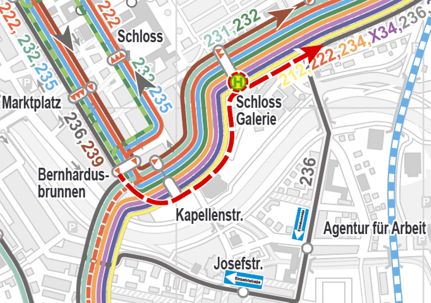 Aufgrund der Bauarbeiten wird die Buslinie 236 in diesem Zeitraum umgeleitet: Die Buslinie 236 fährt ab der Haltestelle "Bernhardusbrunnen" mit Abfahrtszeit zur "Minute 39" in Richtung Bahnhof über die Haltestelle "Schlossgalerie". Die Haltestellen "Josefstraße" und "Agentur für Arbeit" entfallen in Richtung Bahnhof. In der Gegenrichtung ab der Haltestelle „Bahnhof“ mit Abfahrtszeit zur „Minute 17“ bleibt der Linienweg über die Haltestellen „Agentur für Arbeit“ und „Josefstraße“ erhalten