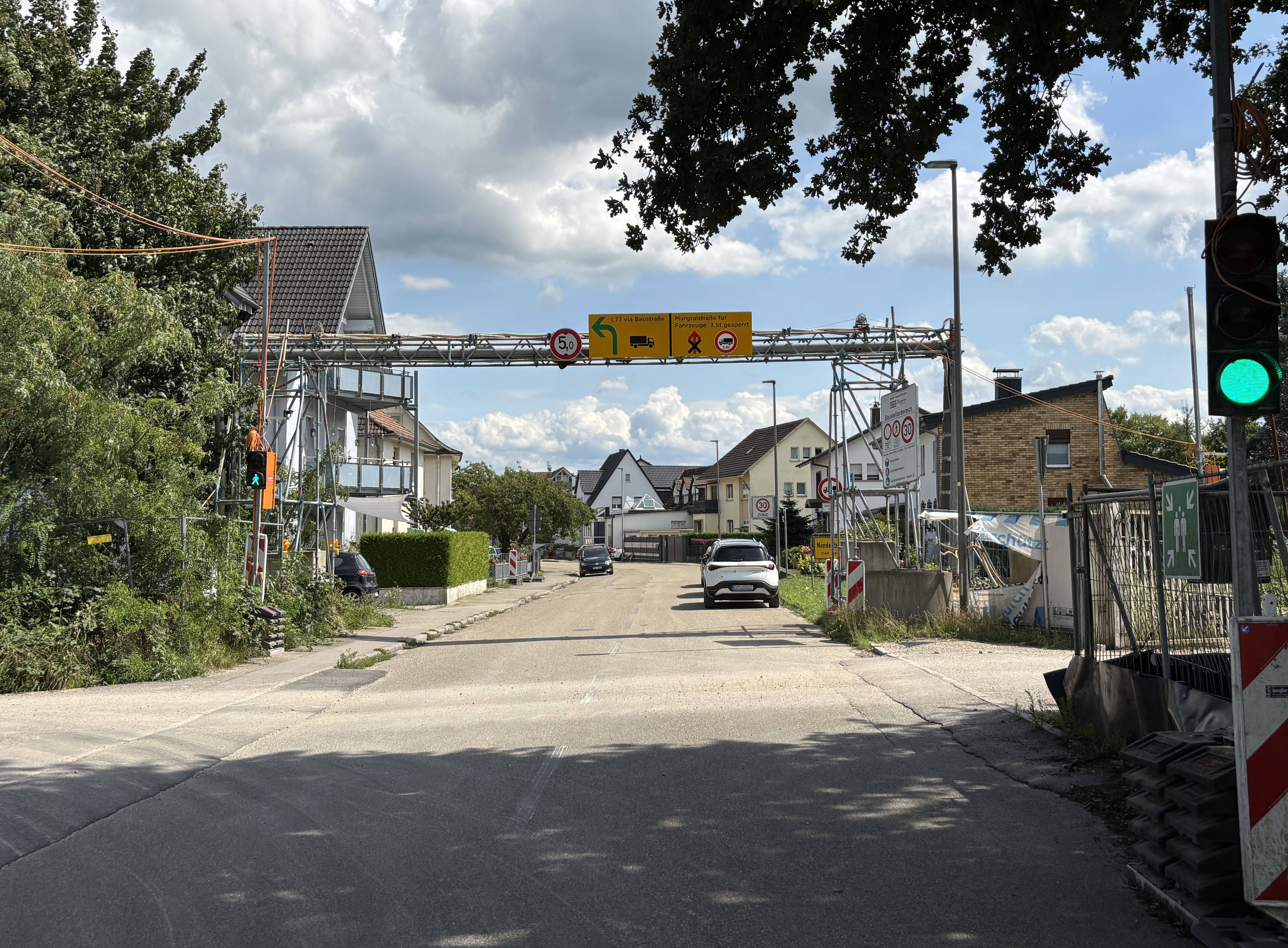So wurde ein großformatiges Hinweisschild an der Leitungsbrücke der Deutschen Bahn im Bereich der nördlichen Murgtalstraße montiert. Es weist LKW-Fahrer deutlich darauf hin, dass sie an dieser Stelle nicht in die Murgtalstraße einfahren sollen. Ein weiteres Banner wurde über der Ampelanlage in Niederbühl (Baulandstraße) angebracht. Es richtet sich an LKWs aus Richtung Niederbühl kommend und macht auch hier unmissverständlich klar: Der Weg führt geradeaus zur Baustelle via L77 – nicht links in die Murgtalstraße. Zudem wurden an der L77 an der Kreuzung Baulandstraße weitere Hinweisschilder angebracht.