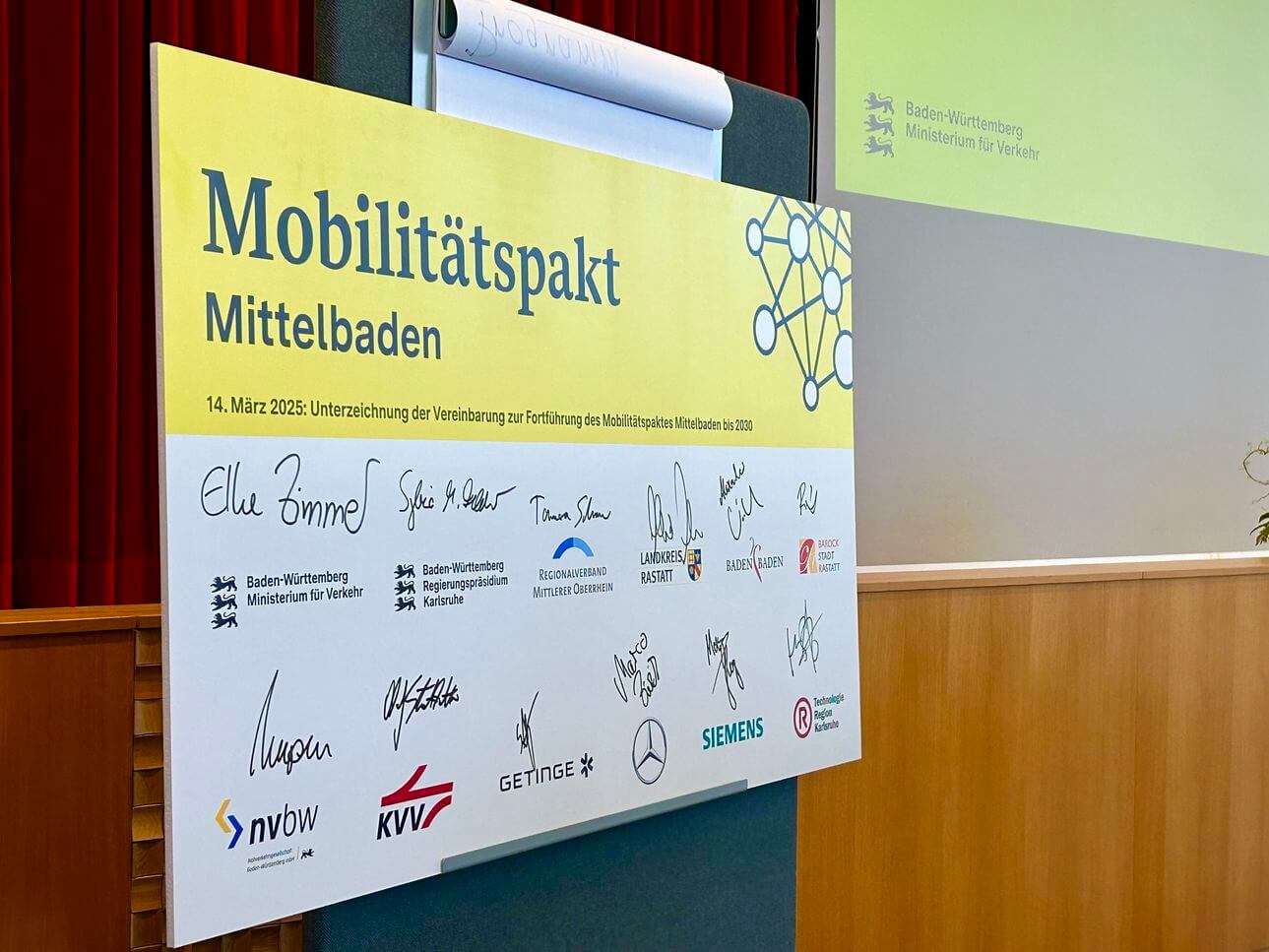 Mit der Stadt Baden-Baden als neuestem Mitglied startete der Mobilitätspakt Mittelbaden unter neuem Namen in die zweite Laufzeit bis 2030. Beim Festakt in Rastatt stellten die Vertreterinnen und Vertreter das neue Arbeitsprogramm vor.
