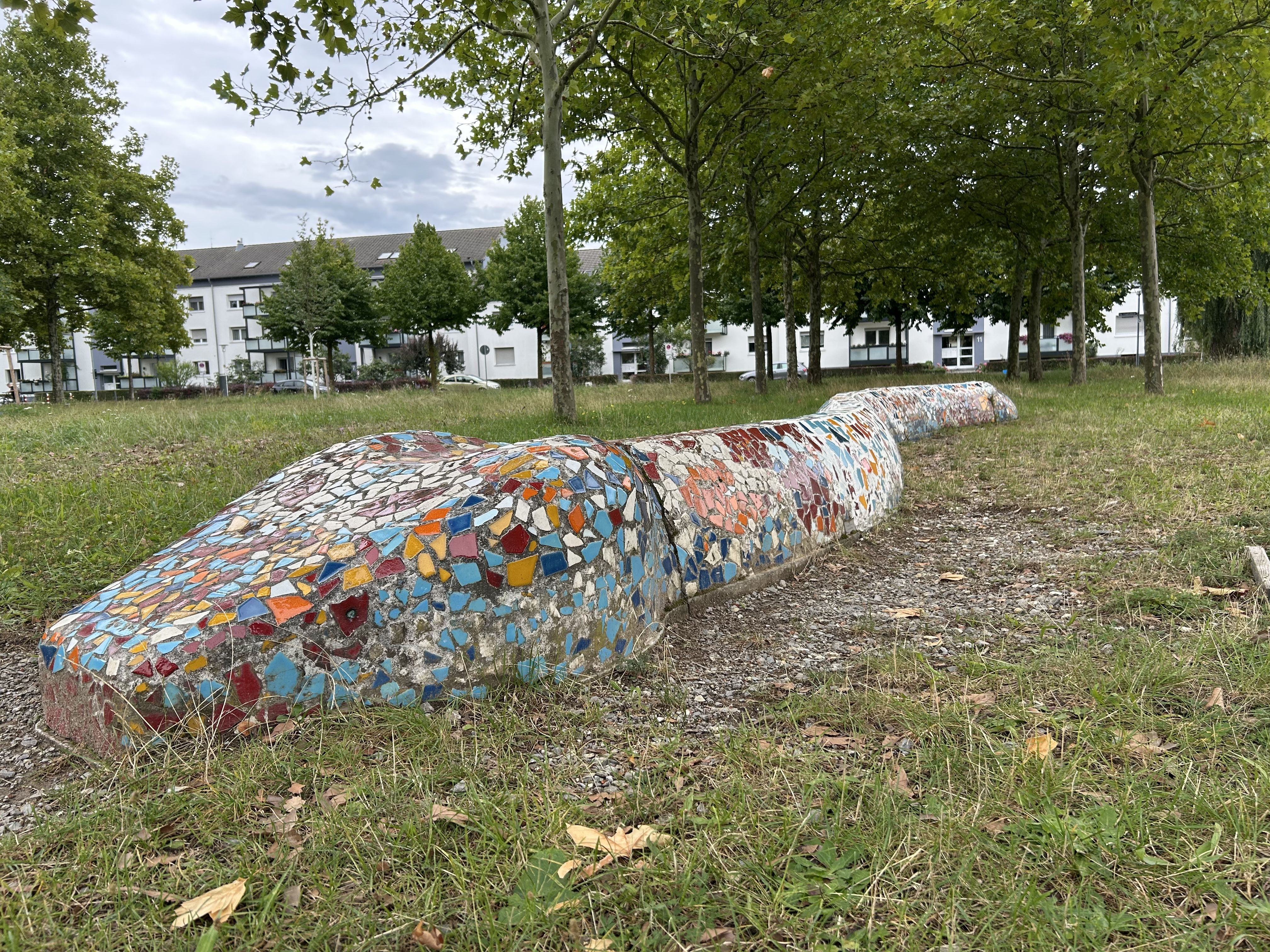 Die Mosaikschlange ist nach mehreren Arbeitseinsätzen nun vollständig und steht den Besucherinnen und Besuchern des Quartiersplatzes zur Verfügung. Sie kann zum Sitzen, für das Balancieren oder als Aufenthaltsort verwendet werden.