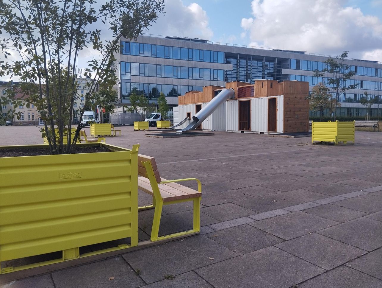 Auf dem Kulturplatz Rastatt ergänzen ab sofort sechs neue Bänke das bestehende Angebot rund um die bereits installierten KukukBoxen und die mobilen Wanderbäume. Die Bänke messen jeweils 1,20 Meter und sind farblich sowie gestalterisch an die gelben Baumcontainer angepasst.