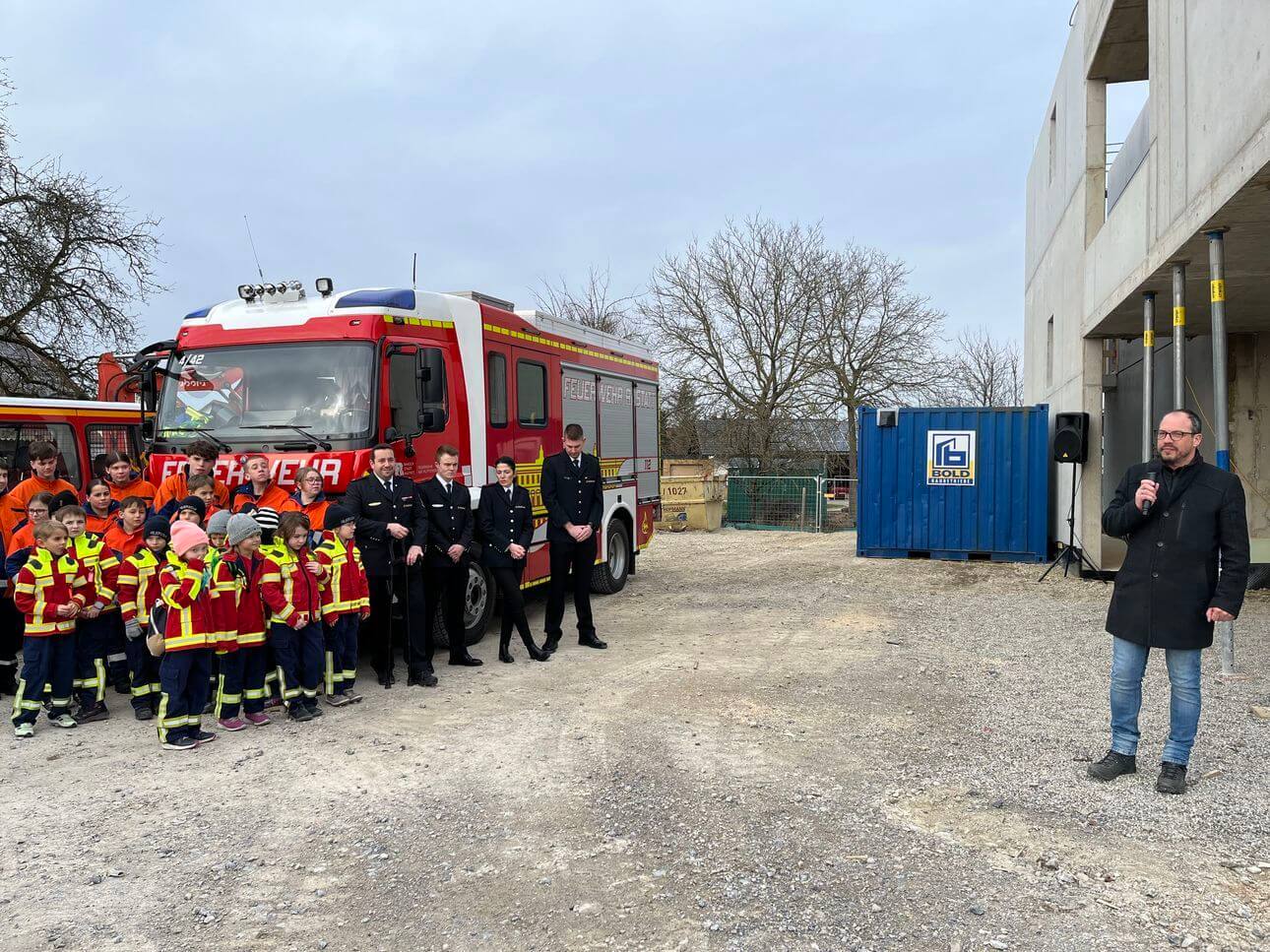 Nach dem traditionellen Richtspruch der Baufirma konnten die Gäste bei einem Rundgang einen ersten Blick auf die Räumlichkeiten werfen und in einem filmischen Rückblick die Baufortschritte nachvollziehen. Der Neubau, geplant vom Architekturbüro ARGE aus Waldkirch, soll sowohl den Anforderungen an moderne Feuerwehreinsätze als auch den Bedürfnissen der Feuerwehrleute gerecht werden. So umfasst das Gebäude Schulungs- und Besprechungsräume, Büros sowie Aufenthaltsbereiche für die Feuerwehrleute. Die Fahrzeughalle verfügt über drei Stellplätze und kann zu einem späteren Zeitpunkt bei Bedarf um einen weiteren Stellplatz nach Osten erweitert werden. Besonderes Augenmerk wird auf eine umweltfreundliche und energieeffiziente Bauweise gelegt. So erhält das Gebäude ein Gründach, auf dem später eine Photovoltaik-Anlage eingerichtet werden kann. Die Energieversorgung erfolgt über eine Wasser-Luft-Wärmepumpe.