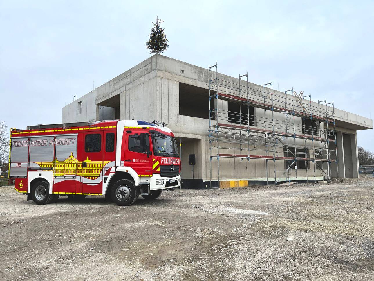 Die Bauarbeiten für die neue Feuerwache in Plittersdorf schreiten zügig voran. Knapp ein Jahr nach dem Spatenstich konnte am Mittwoch, 19. Februar, Richtfest gefeiert werden. Im Beisein zahlreicher Mitglieder der Freiwilligen Feuerwehr Plittersdorf, Vertreterinnen und Vertretern des Ortschafts- und Gemeinderats sowie am Bau beteiligter Firmen und Mitarbeitenden machte Oberbürgermeisterin Monika Müller deutlich, dass mit der neuen Feuerwache nicht nur der Brandschutz und damit die Sicherheit für Plittersdorf gestärkt wird, sondern auch der Ortseingang ein neues Gesicht bekommt:. „Wer in Plittersdorf reinfährt und die Feuerwache sieht, weiß sich künftig gleich in guten Händen“, betonte Müller.