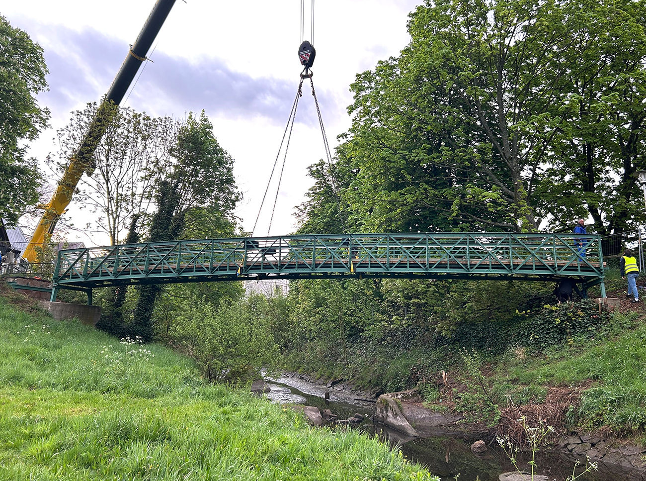 Ein beeindruckender Anblick am frühen Mittwochmorgen, 16. April: In rund 40 Metern Höhe schwebte der frisch sanierte Schachtelbachsteg gegen 7 Uhr über den Bachlauf bei der Kanalstraße, ehe er zurück an seinen angestammten Platz gesetzt wurde. In den vergangenen fünf Monaten war die Brücke von einem spezialisierten Stahl- und Bauunternehmen aus Ottersweier umfassend saniert und restauriert worden.