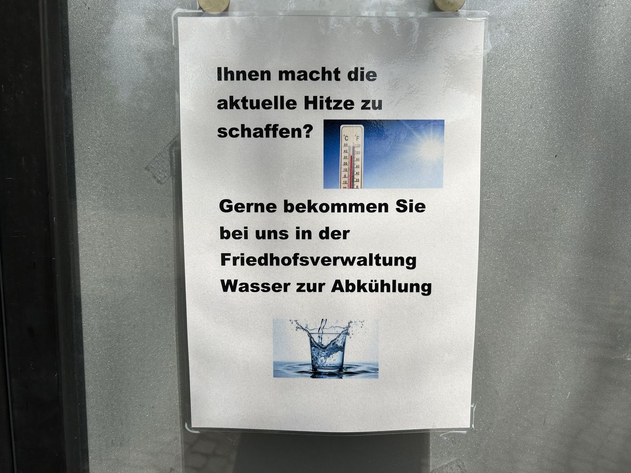 Hitzevorsorge durch Trinkwasser für ältere Friedhofsbesucher: Hinweisschilder auf Rastatter Friedhöfen informieren