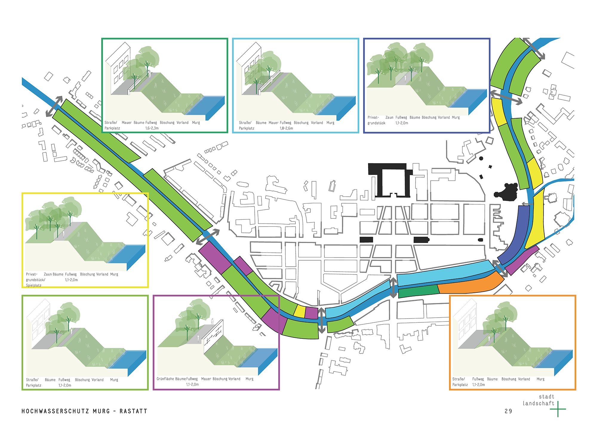 In der folgenden Übersicht sind sieben unterschiedliche Typologien dargestellt, die den aktuellen Stand von 2024 wiederspiegeln. Sie unterscheiden sich hauptsächlich in der Baum- und Mauerstellung und beschreiben den Übergang vom Murgvorland zur Stadt. Es sind unter anderem verschiedene Freiräume sowie häufig variierende Hochwasserschutzbauwerke wie Dämme und Mauern zu erkennen. Dies erfordert situationsabhängig verschiedene Lösungsansätze für die Planungen der Hochwasserschutzmaßnahmen sowie die Einbindung dieser in den Freiraum.